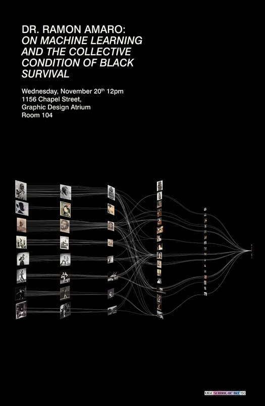 Hosted in conjunction with the public lectures organized by the Yale School of Art in tandem with its 150th anniversary and its status as a co-educational professional school of art, scholar and educator Dr. Ramon Amaro will deliver a public lecture on the afternoon of November 20th on his recent research regarding machine learning as it relates to systems of value and racialized exclusion.