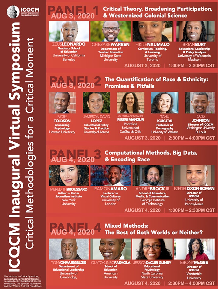 The ICQCM Inaugural Virtual Symposium: Critical Methodologies for a Critical Moment reflects the urgent need of a data science that provides theoretical intervention and a fuller understanding of the social impact of QCM, but also a dialogue that will frame the technical mission of ICQCM: to provide training in quantitative and computational methods, and their integration into mixed methodologies, to at least 70 underrepresented scholars and affiliates of majority of color institutions of higher education. This conversation is essential to the success of that mission.