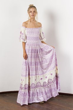 "Hummingbird" Women's printed and embroidered maxi dress with shirred bodice - Lilac