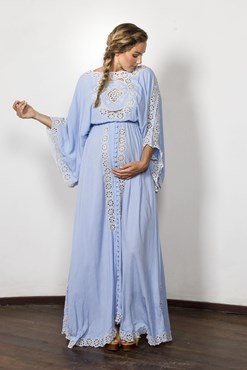 "Zippora" Cut-Work Embroidery Maternity Maxi Dress - Chambray blue with cream