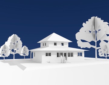 We call this design “Homage”. It has two full bathrooms and up to three bedrooms, with an accessible ground floor for wheelchair users and folks with mobility challenges, all in 1480 square feet, plus 80 square feet of covered porch. The ground floor has an entry vestibule, accessible kitchen, eating space, sitting space, laundry area, accessible bathroom and a bedroom. The upper floor is flexible: it has a full bathroom and can have two small bedrooms, a larger bedroom with office/study, or other configurations. The home has thick walls and roofs for ample insulation, and generous south-facing windows for passive-solar heating. It’s designed to be comfortable, healthy, efficient, durable, and adaptable.