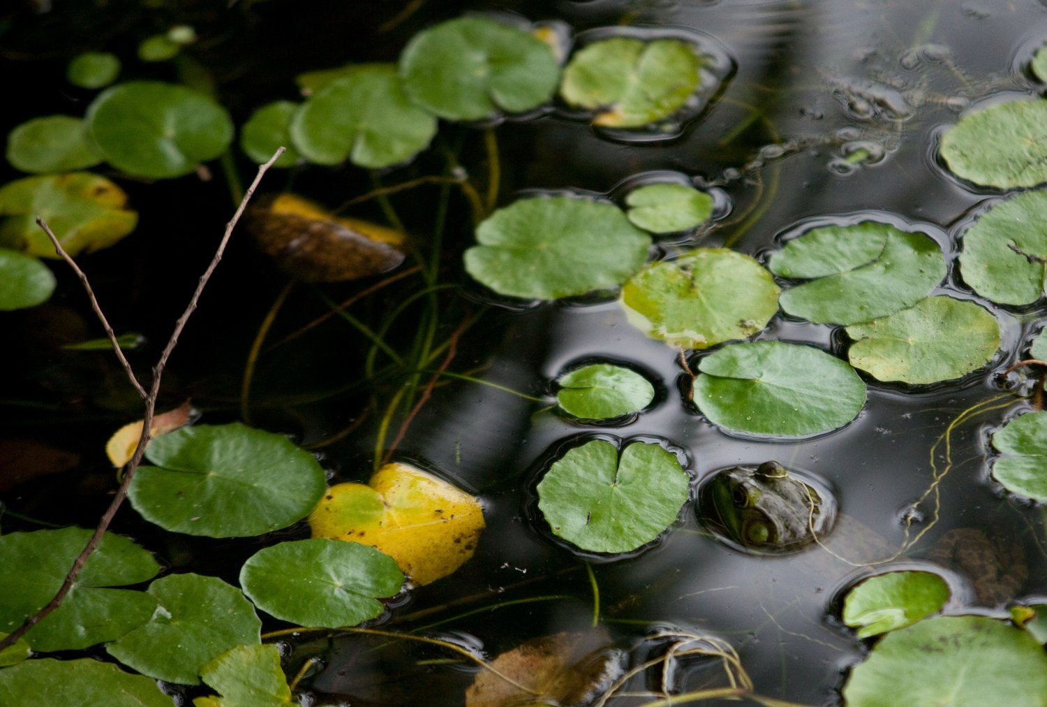 Pond frogs silent at noon. Cardinals,